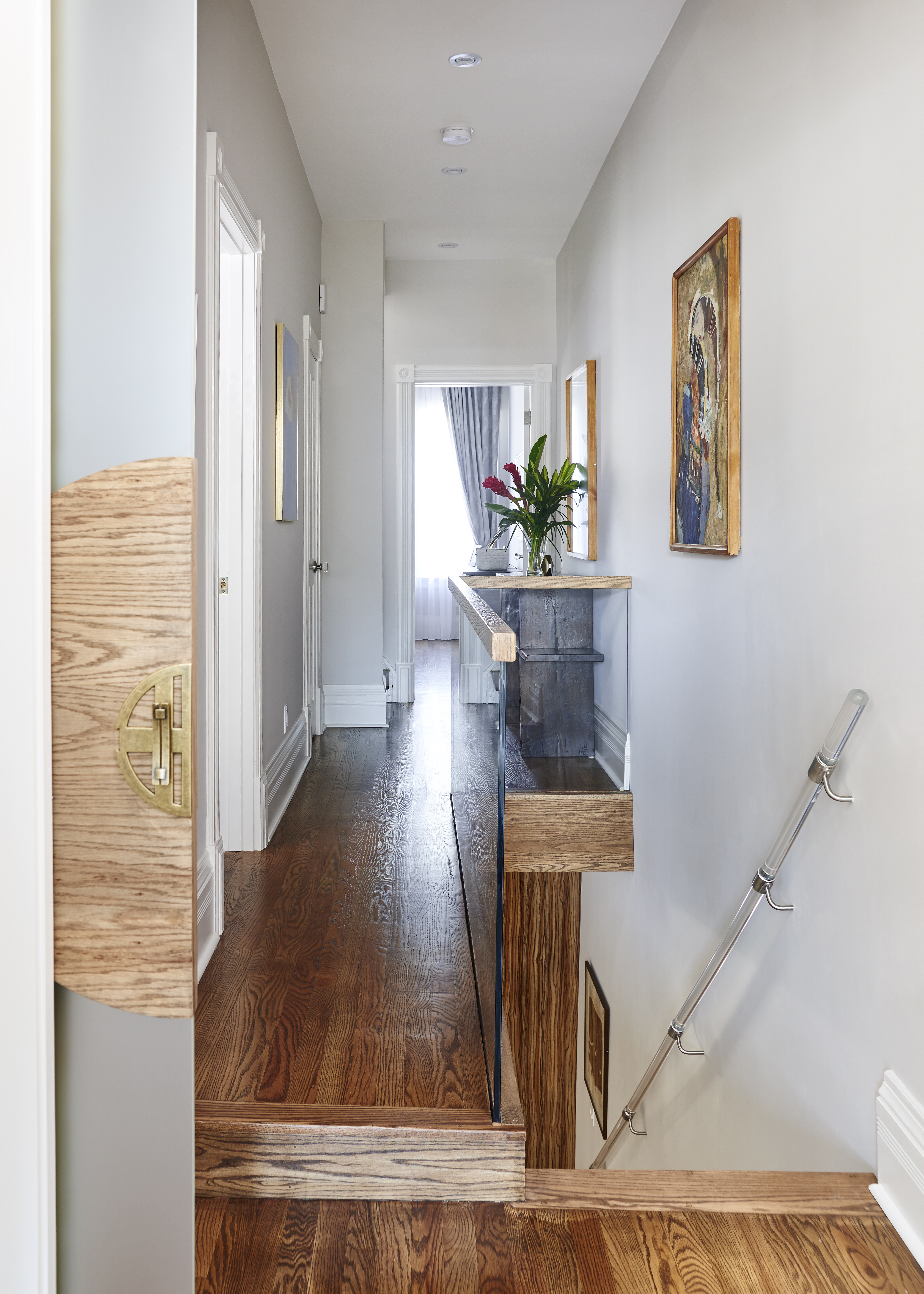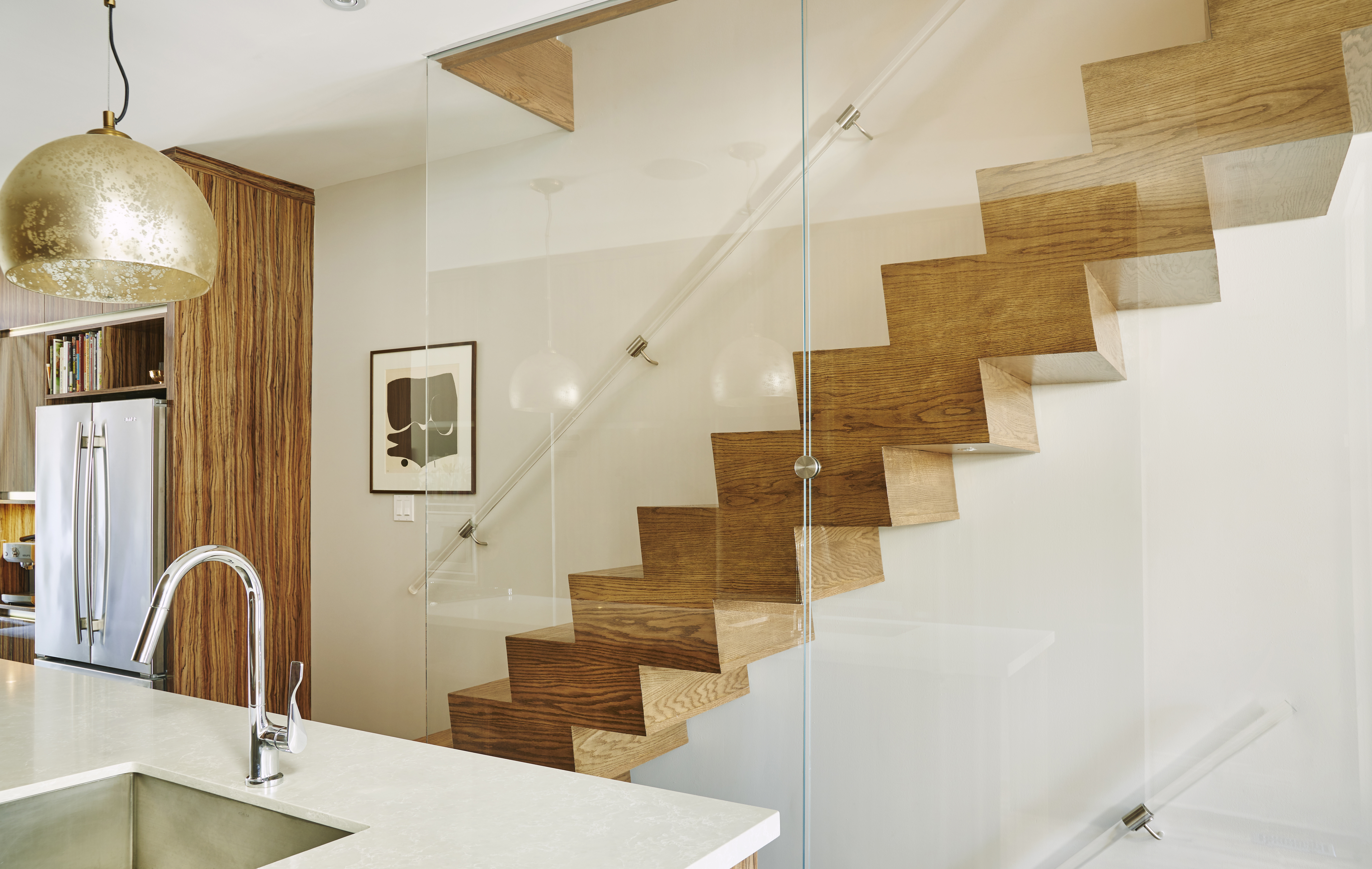 Inside, I was able to combine the charming elements already a part of the house with contemporary new additions. Exposed red brick turned into a feature spot beside the new glass wall. Oak wood floating stairs seamlessly blend the floors between levels.